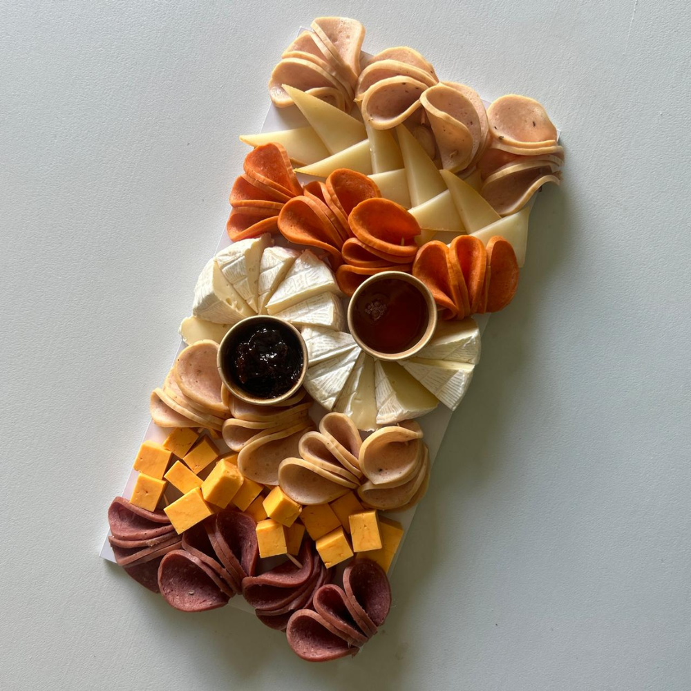Indulge in the visual feast of our exquisite charcuterie boards, meticulously curated with an assortment of cold cuts, cheeses, dips, fruits, veggies, and accompaniments, all customized to match your desired serving size. Available in a range of sizes, these distinctive charcuterie boards elevate your gatherings and meetups to a new level of sophistication.
