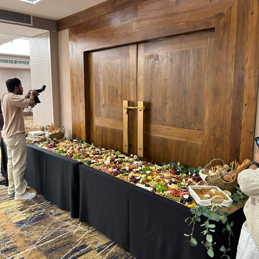 Our graze tables showcase a thoughtfully curated selection of premium artisanal cheeses and cold cuts, complemented by gourmet crackers, French breads, baguettes, and breadsticks. The spread is elevated with flavourful dips such as date and lime chutney, hummus, and cheese dips, alongside a diverse range of carefully chosen accoutrements. For additional savoury and sweet offerings, we provide a dedicated high tea snack menu available for outsourcing at associated costs, along with a minimal service charge for arrangement and presentation.