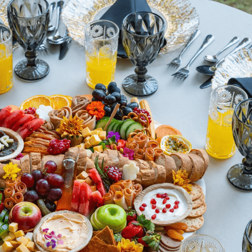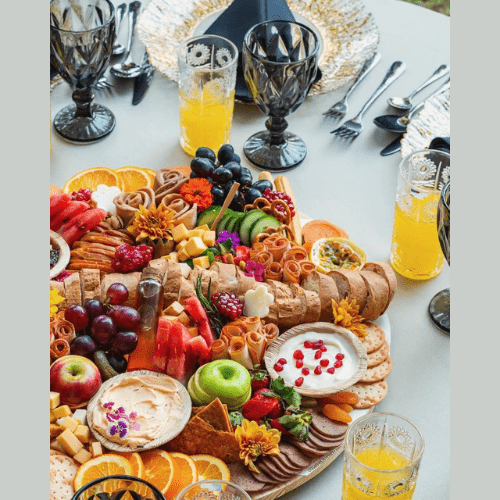 This sumptuous board offers everything needed for a complete charcuterie experience. It features a delightful assortment of fruits, veggies, crackers, olives,French bread, honey, cheese dips, date and lime chutney, dried fruits, nuts, bread sticks, a variety of cheeses, cold cuts, chicken slices, and is beautifully garnished with flowers and rosemary.
