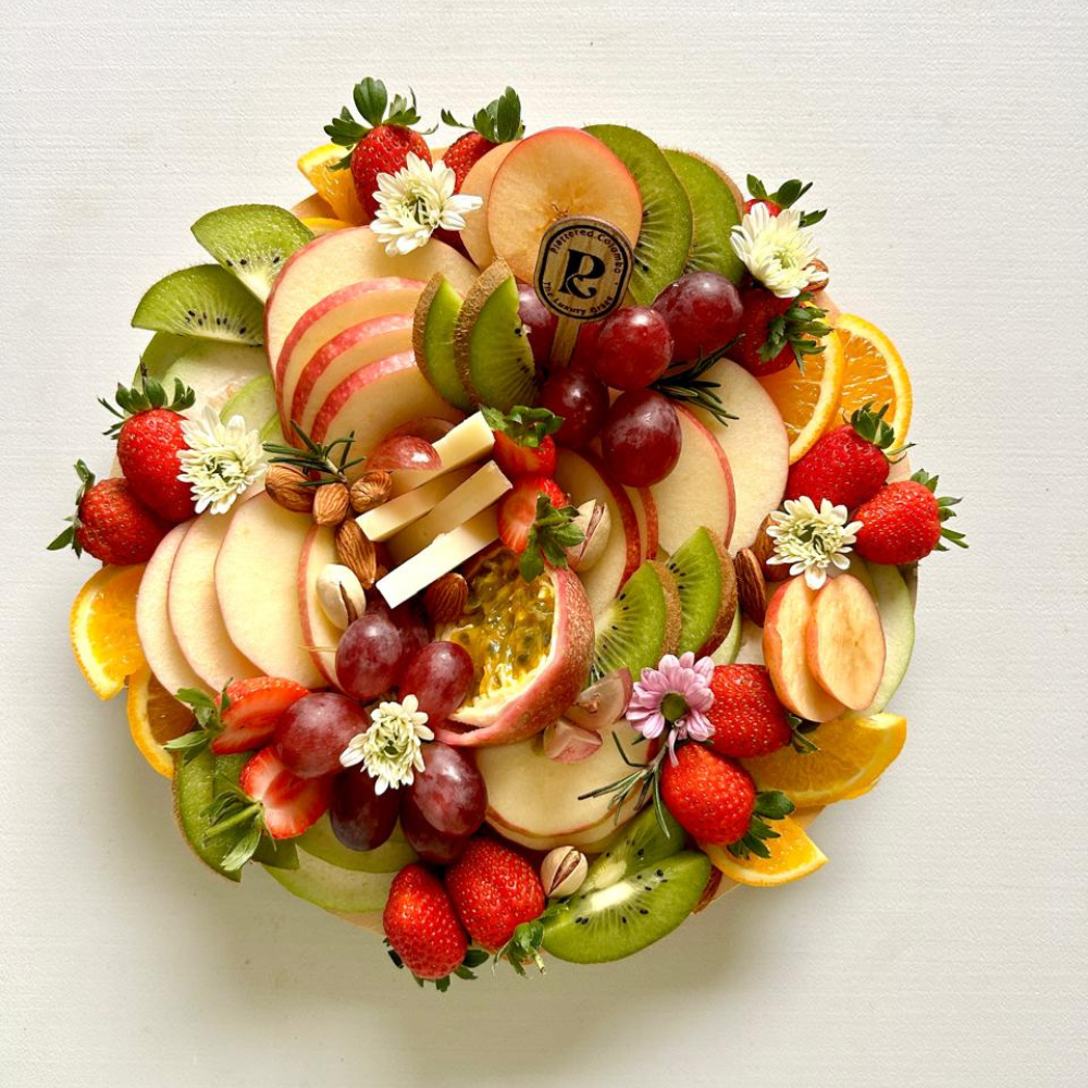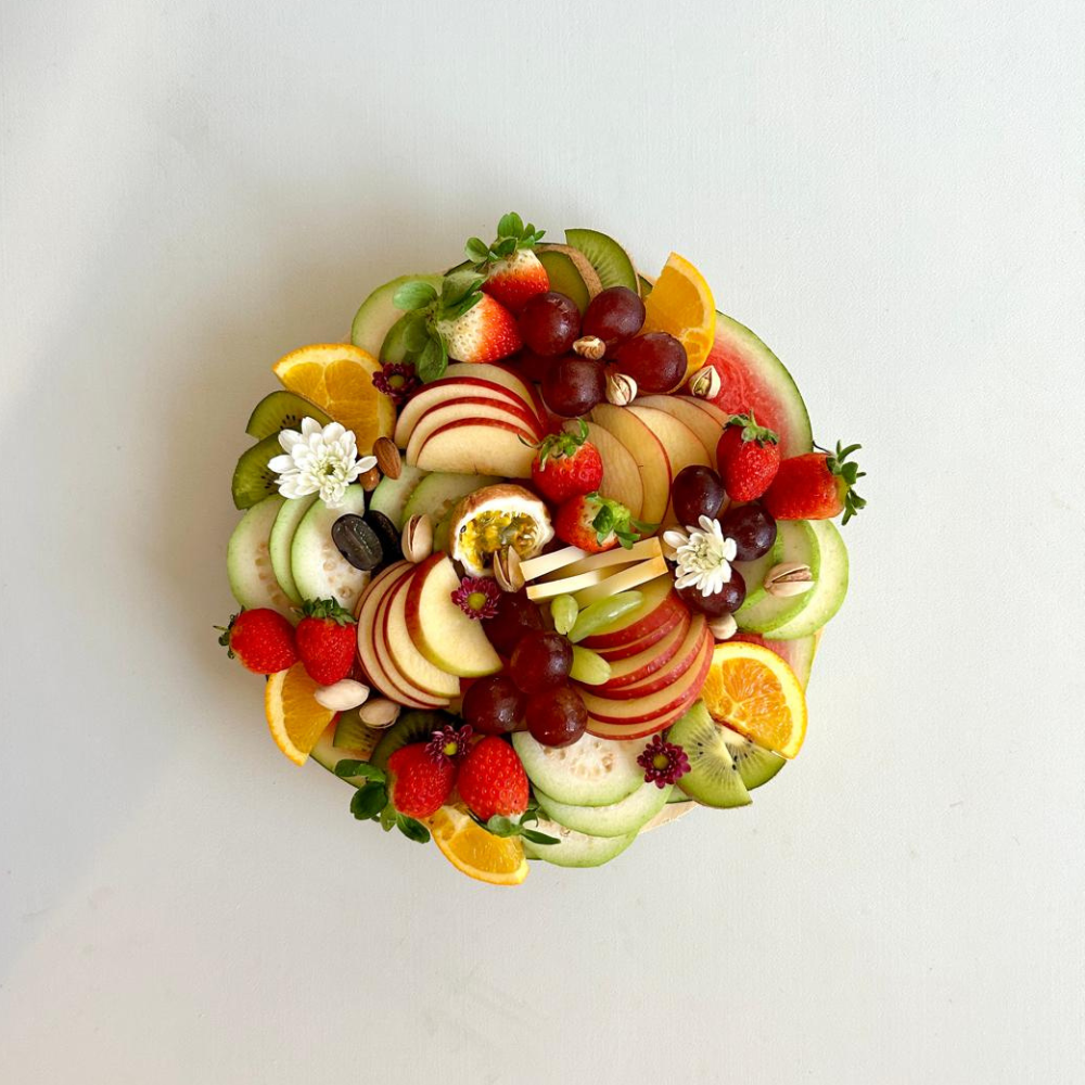 Guava,orange, apple, kiwi, grapes, strawberries, and passion fruit, complemented with premium cheese and nuts.